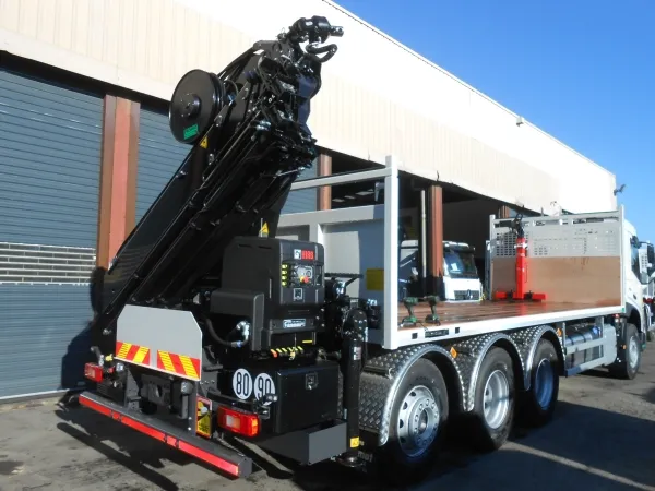 Camion de marque VOLVO type 8x4 tridem équipé d'une grue HIAB 262 en 6 rallonges avec plateau de longueur utile 7 m.